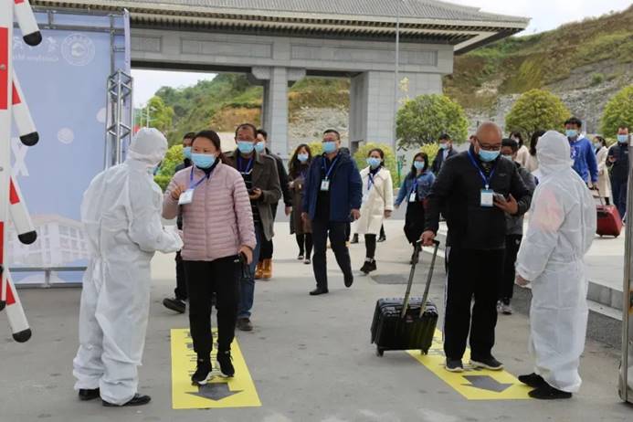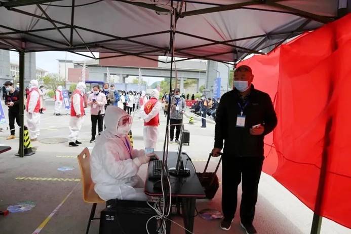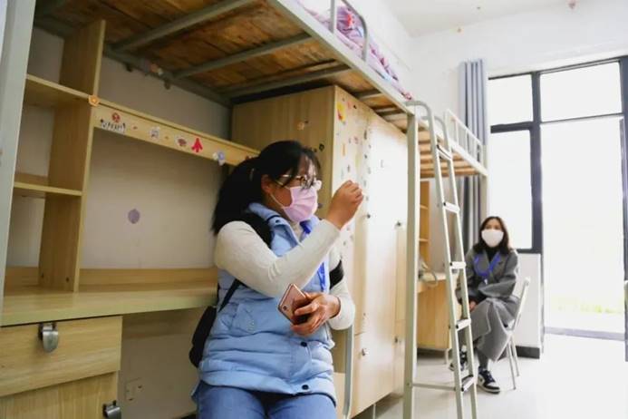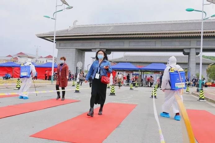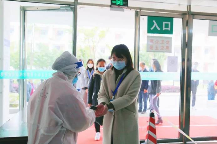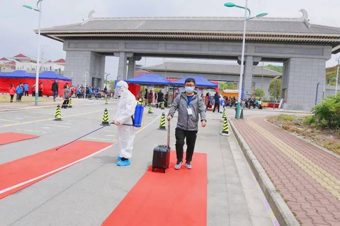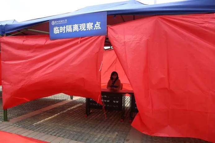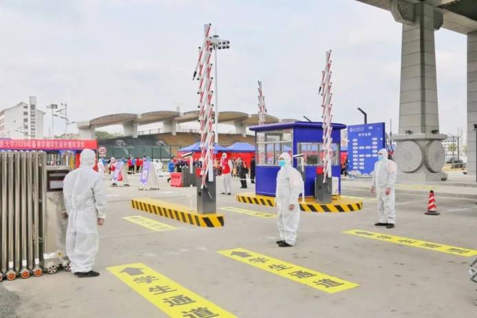 “同学,请出示学生证。”在大学城校区二号门外,40名辅导员扮演学生,背着书包、推着行李箱,保持安全距离在门闸处核验身份。在缓冲区扫码后到达测温区,出示扫码结果,工作人员查验后依次为大家测量体温,体温正常的学生携带行李通过消毒通道,工作人员对行李和脚底进行消毒,更换口罩、手部消毒后前往宿舍,通过钉钉打卡向学校报告。过程中,在测温区出现体温异常的学生,医护人员迅速将其带至学校临时隔离观测点留观。