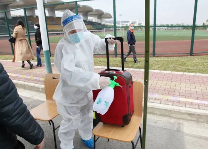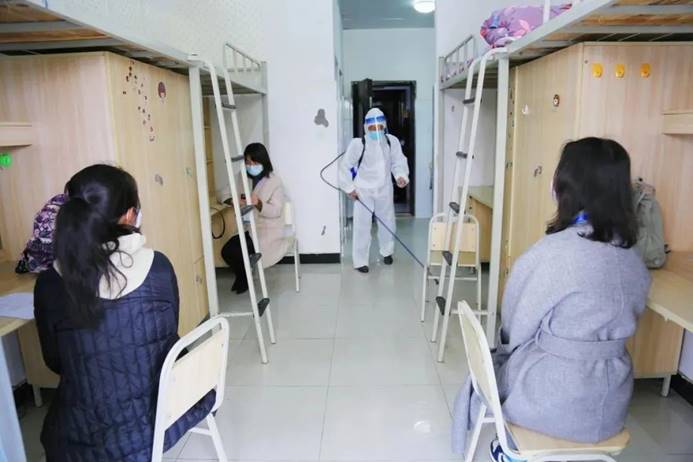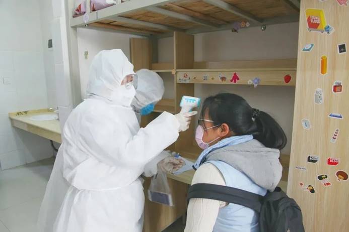 “老师,您好!我们是传媒学院3栋114宿舍的同学,我们宿舍有同学体温高于37.3度....”“同学,请你们保持安全距离,宿舍保持通风,我们马上处理!”演练中,模拟的是返校后学生在宿舍出现发热症状的案例。一位学生在每日体温自测时发现体温异常,立即拨打学校疫情防控热线电话,随后拨打辅导员电话上报学院。医务人员及专车迅速到达,经现场处置后将发热学生送往学校集中观察点,按照流程进行处置。后勤服务人员立即对该生所在宿舍、楼道沿线进行现场消杀。