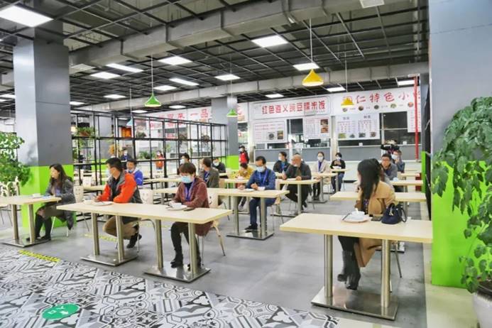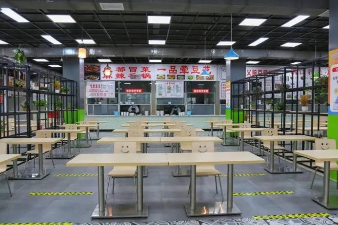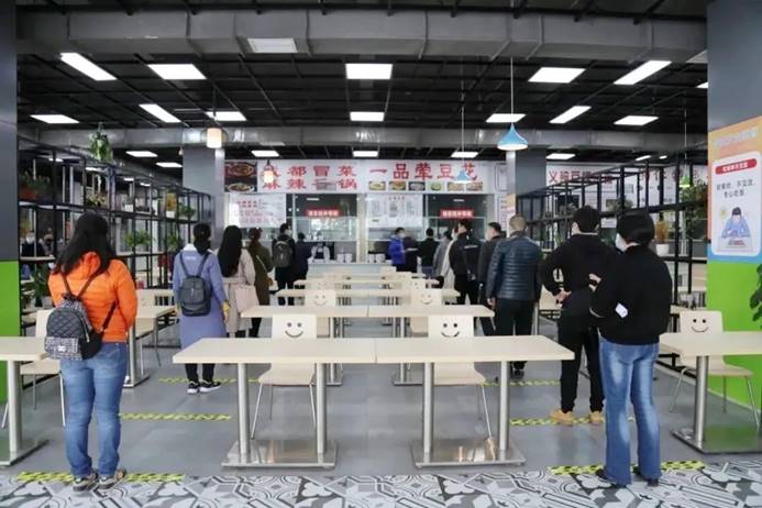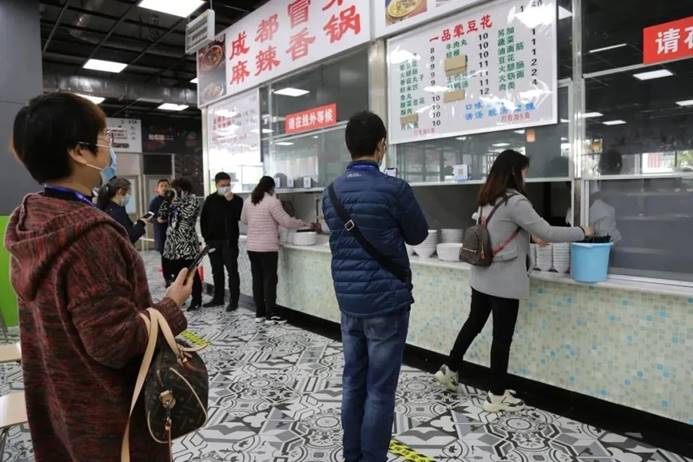 学生根据规定就餐时间,在寝室洗手,佩戴口罩后,自行到食堂就餐,在食堂入口处,根据现场工作人员引导间隔1米以上安全距离有序排队,进行手部消毒后进入,按引导标线有序到窗口取餐,保持一人一桌,同向就坐进餐,就餐结束后按食堂出口引导标线离开。