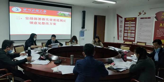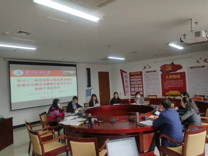 代光玉书记传达学习关于十二届省委第七轮巡视省属高校集中反馈会议精神及褚光荣书记的两个表态发言。要求各科室老师要进一步强化政治意识,将巡视整改任务统一到省委和学校的要求上来,抓细抓小抓实。