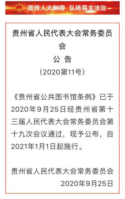 《贵州省公共图书馆条例》已由贵州省第十三届人民代表大会常务委员会第十九次会议于2020年9月25日通过,自2021年1月1日起施行。