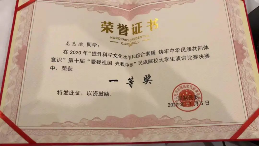 在演讲中,我无比骄傲和自豪的向全国各民族院校的老师同学们讲述了我的家乡贵州的发展巨变,让大家对贵州有更多的了解和认识。家乡的变化与发展,也是祖国繁荣昌盛的缩影,作为新时代的青年,我们应该珍惜当下、更应该发挥青年人的热情与活力、为国家建设民族复兴,发挥出青年人的朝气力量!
