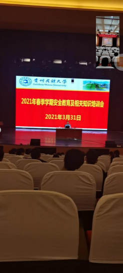为进一步加强平安校园建设,切实维护校园安全稳定,进一步提高全校师生的安全意识和法制意识,我校于2021年3月31日在大学城校区学生活动中心大礼堂和花溪校区15号教学楼会议中心线上线下同时开展春季学期安全教育及相关知识培训。各学院及相关职能部门负责人、全体辅导员、各学院班干代表 、寝室长代表参会。会议由保卫处欧阳宁康主持。