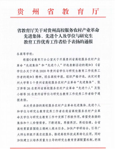 近日贵州省教育厅下发了《省教育厅关于对贵州高校服务农村产业革命先进集体、先进个人及学位与研究生教育工作优秀工作者给予表扬的通报》,我校董强老师和李荣老师被评为学位与研究生教育工作优秀工作者。