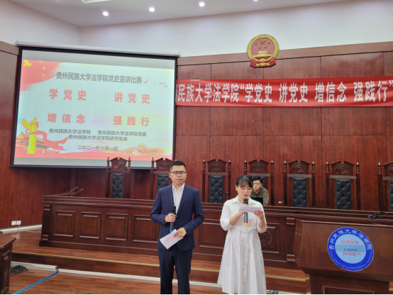 为响应党中央号召,庆祝中国共产党百年华诞,贵州民族大学法学院在2021年6月1日14:00于法学院 学术报告厅 进行党史宣讲比赛。法学院党委书记石世文同志出席比赛现场并担任评委,这次比赛的评委还有法学院杨轶老师、丁莲媛老师、高俊英老师、刘飞越老师。