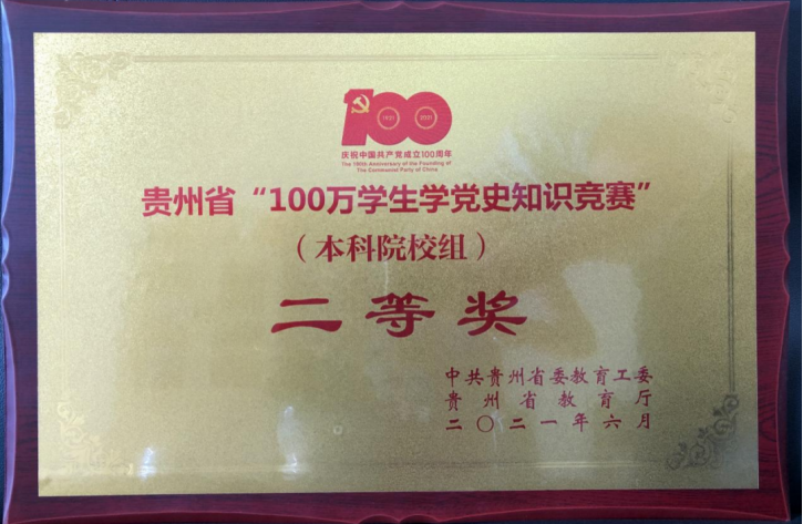 6月16日,由贵州省教育工委、省教育厅主办,省教育宣传中心和贵州财经大学承办的贵州省“100万学生学党史知识竞赛”决赛在贵州财经大学大学城校区举行。我校与来自全省其他不同市州的9所本科院校同台角逐,我校最终以现场总积分第二的优异成绩,荣获全省本科院校组二等奖。
