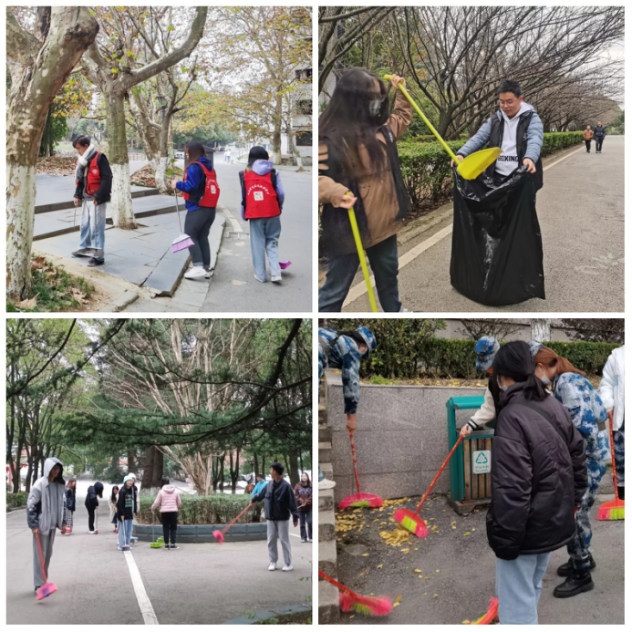 各组织分工明确,互相配合。寒风呼呼地吹到同学们身上,但这丝毫没有影响大家打扫的热情。在清扫的过程中,同学们一路上欢声笑语,让冷清的清晨校园一下子热闹了许多。