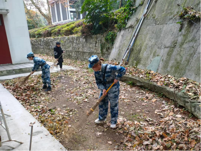 7:50,民大学生在线新闻中心、学工助理团队、心理健康服务团、国旗护卫队、军旅协会五大组织的学生干部在老图书馆集合,由相关负责人带领大家打扫相应的区域。