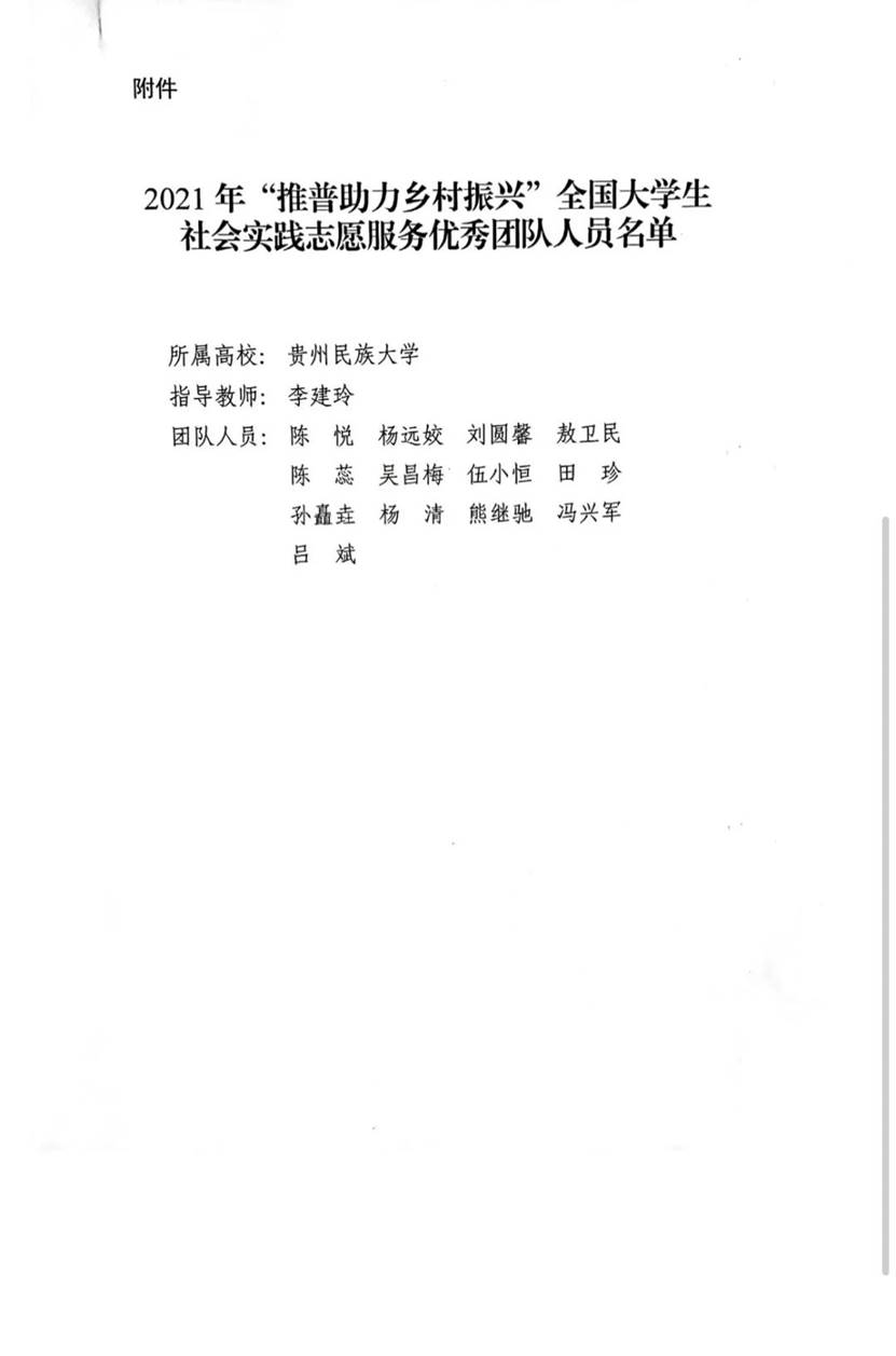 为深入贯彻习近平总书记关于教育的重要论述精神,全面落实全国语言文字会议精神,加大民族地区、农村地区国家通用语言文字推广力度,服务乡村振兴,教育部语言文字应用管理司、共青团中央发展部于2021年暑期共同发起了“推普助力乡村振兴”全国大学生暑期社会实践志愿服务活动。 贵州民族大学惠水县双语志愿服务团深入贵州省黔南布依族苗族自治州惠水县幸福移民社区,以“3+1项目”(宣讲推普、科技推普、技能推普+专项调研)的活动形式,面向社区居民开展了“我为群众办实事|推普助力乡村振兴”社会实践志愿服务活动,荣获2021年“推普助力乡村振兴”全国大学生社会实践志愿服务优秀团队。教育部语言文字应用管理司、共青团中央发展部特致函予以表扬。