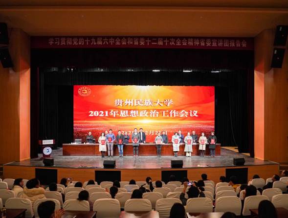 12月21日,贵州民族大学2021年思想政治工作会在大学城校区召开,校党委书记褚光荣出席并讲话,校党委副书记、校长王林主持会议。校领导张鹏程、杨声国、熊元、周杰、任达森、黄其松以及校党委委员奉振、任洁出席。各职能部门负责人,学院党政主要负责人,全体辅导员、教师代表、学生代表近400人参会。