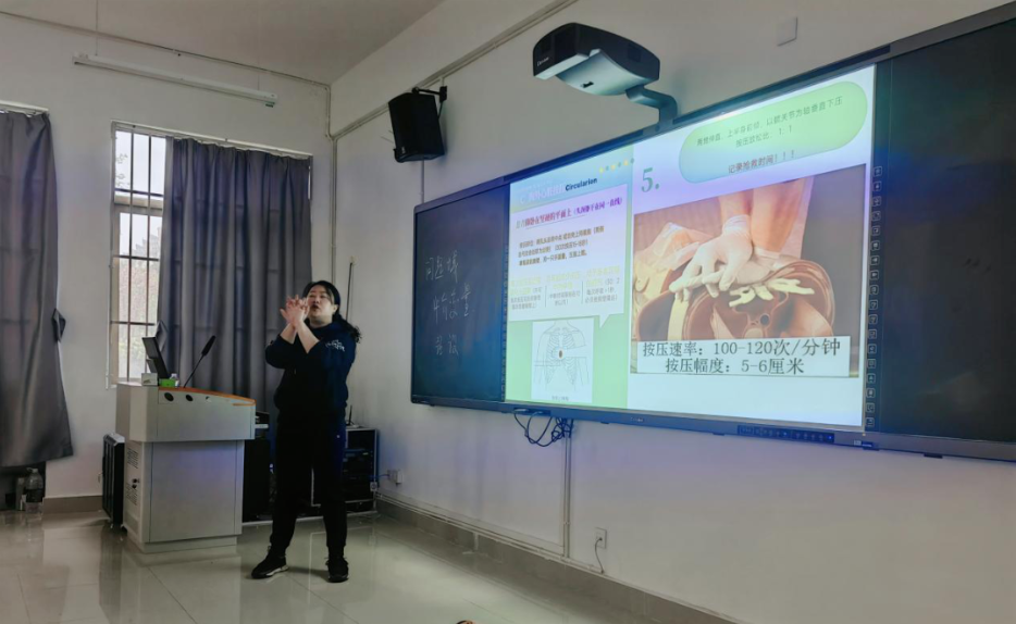 理论讲解在社会学院A206室展开。韦维采用“视频案例+三维动画”的新颖形式,详细阐释了应急救护的基本概念、原则、步骤及重要性。她重点讲解了心肺复苏(CPR)的原理、自动体外除颤仪(AED)的使用方法、清理口腔异物的方法,以及为昏迷患者调整体位的技巧,并深入剖析了急救过程中的注意事项与常见误区,加深了学员们对急救知识的理解。