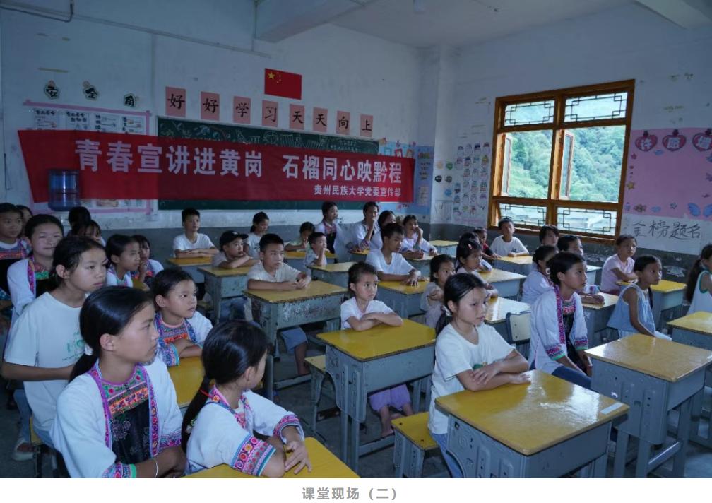 为响应国家通用语言文字推广号召,助力乡村教育发展,7月22日,贵州民族大学党委宣传部“红石榴”民族进步团结宣讲团走进黔东南州黎平县黄岗村,开展“推普助力乡村振兴”全国大学生暑期社会实践志愿服务活动,以普通话推广为纽带,通过多种趣味横生的朗诵挑战,不仅为孩子们带来趣味语言文化体验,更在潜移默化中搭建起语言传承与文化认同的桥梁。
