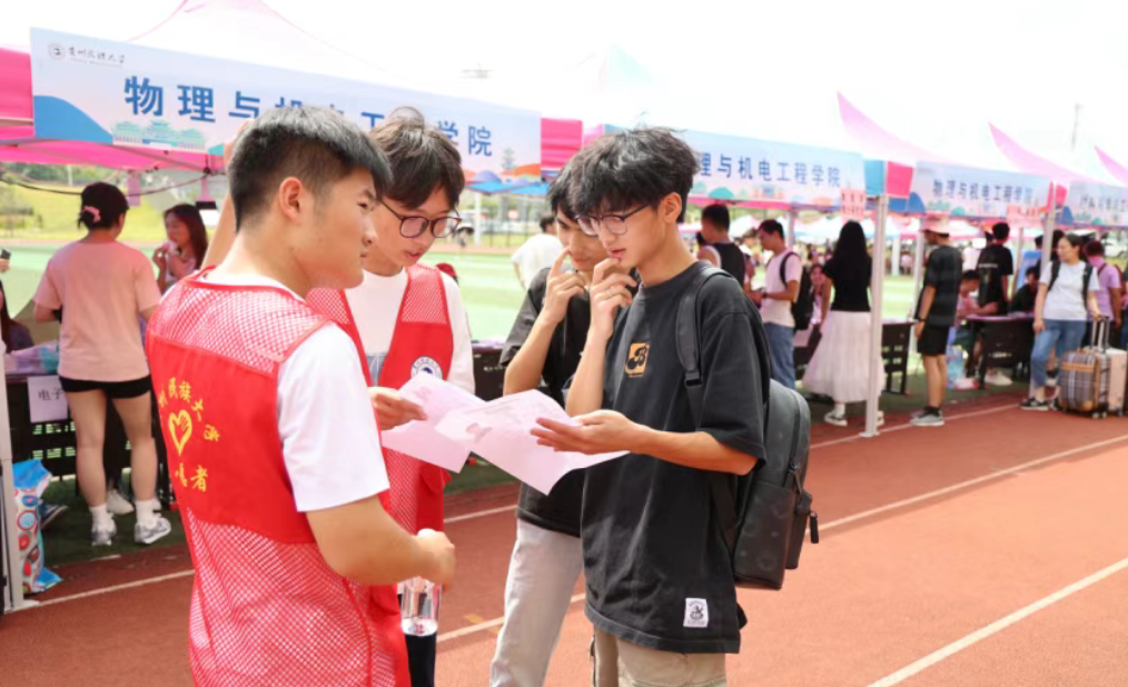 为新生报到提供便利。学校在贵阳火车站、贵阳北站、贵阳东站、大学城快铁站、金阳客车站、贵阳客运东站都设立了校外接待站,从上午8:00 - 晚上19:00,工作人员和志愿者们坚守岗位,引导新生和家长乘坐迎新专车,安全有序地前往校园。南、北校区校内也分别在图书馆前广场和田径场内设置了迎新接待点,各个接待点分工明确、井然有序。