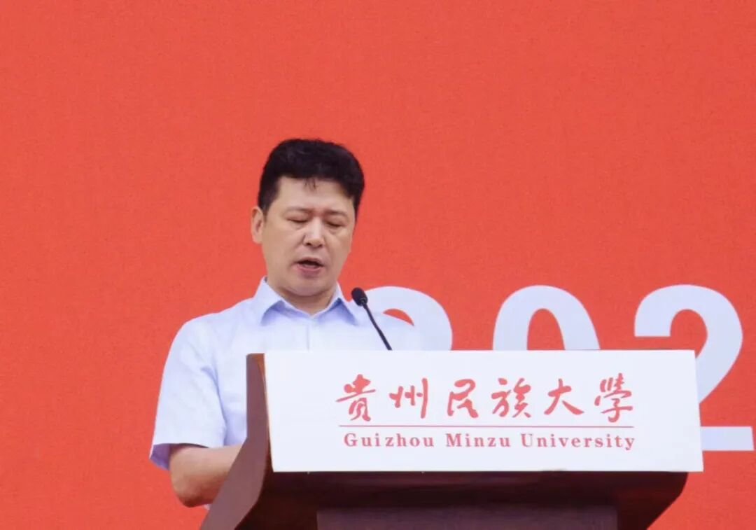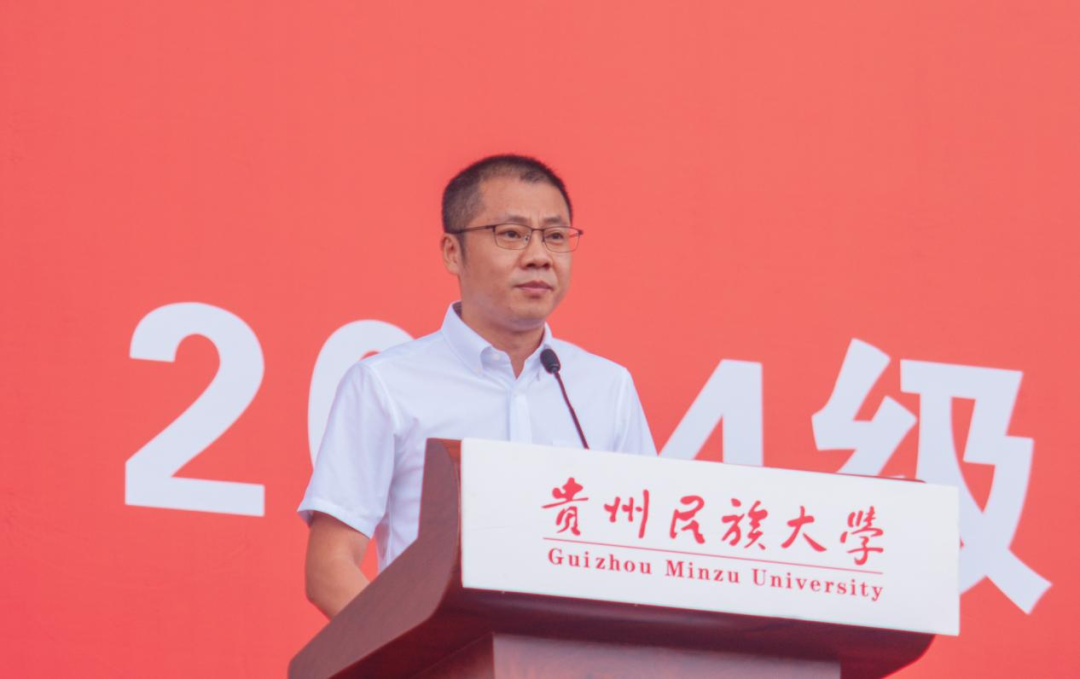 教师代表中华民族共同体研究中心郝亚明教授代表贵州民族大学全体教师,对来自全国各地的新生同学们表示热烈的欢迎,也诚挚祝福全体新生在学校身心健康、学有所成、一切顺利。随后他与新同学们分享三点心得与期许:要相信投入和奋斗,不断提升能力;接触社会和世界,不断开阔眼界;拥抱青春和当下,不断完善自我。并祝愿同学们的大学生活丰富精彩,充满成长与收获,毕业后能遇到更好的自己,不负青春、不负家国、不负时代。