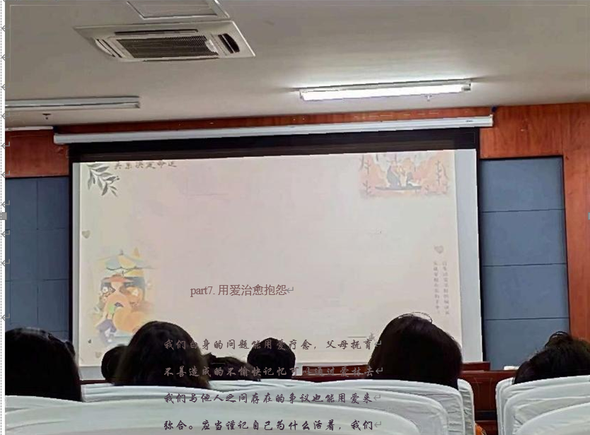 紧接着,主讲人张觉囡开始向我们介绍《不抱怨的世界》 一书。她以什么是无意识的无能、有意识的无能、有意识的有能、无意识的有能四个问题与同学 们进行探讨,引出本书的主题。从七个方面向同学们详细介绍了这本书:你决 定着关系的走向;当不同世界碰撞时,别把不同视为不一致;如何让自我得到 满足;我们为何会抱怨;释放和处理抱怨;与自己和解;用爱治愈抱怨。深入显出,生动形象。