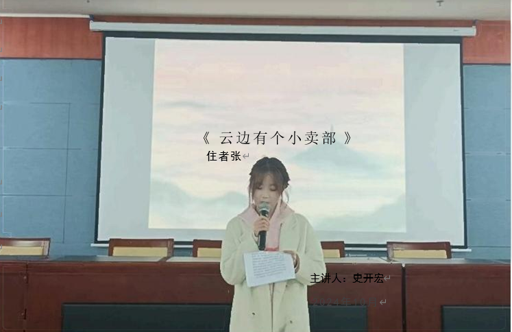 首先,由史开宏同学带领同学们解读《云边有个小卖部》。史开宏同学在阅读 该书时领悟到: 一个人一生成长中需要亲情、友情、爱情的力量,以及积极进取、 勇敢面对生活挑战的精神。他鼓励我们每个人都要保持乐观的心态,勇往直前。