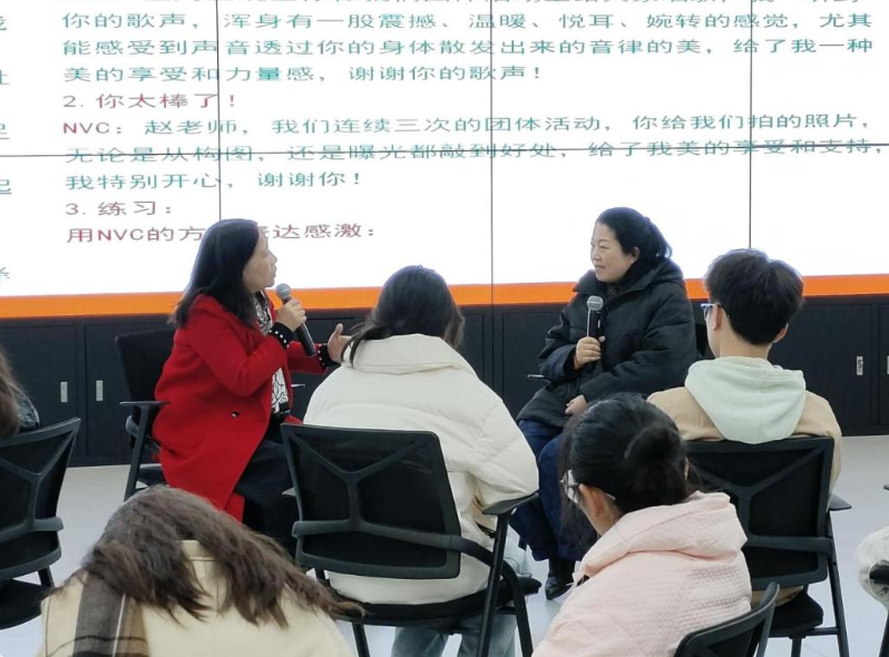 接下来,粟志华老师采用回顾和视频学习的方法,帮助同学们深入理解“非暴力沟通”理念,为学习新知识点——如何表达感激打下坚实基础。粟志华老师通过与赵静老师互动,向同学们示范如何运用非暴力表达感激之情,提升人际沟通的能力和沟通的品质。