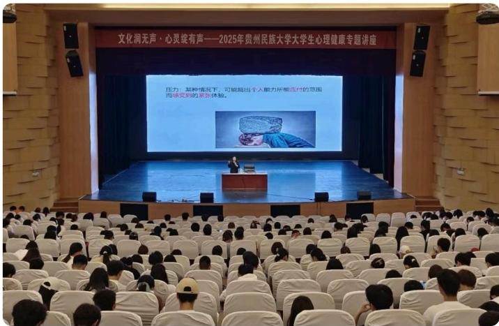 为帮助大学生更好地应对学业压力、缓解就业焦虑,建立健康、积极的 恋爱观,贵州民族大学学工部于2025年5月16日在南校区C3活动中心大礼 堂举办大学生心理健康专题讲座。本次讲座邀请我校学工部陈玉荣教授、贵 阳华夏心理学校资深心理咨询师张艳老师主讲。活动通过理论讲解、案例分 析和互动体验等多种形式,为同学们提供专业的心理指导。