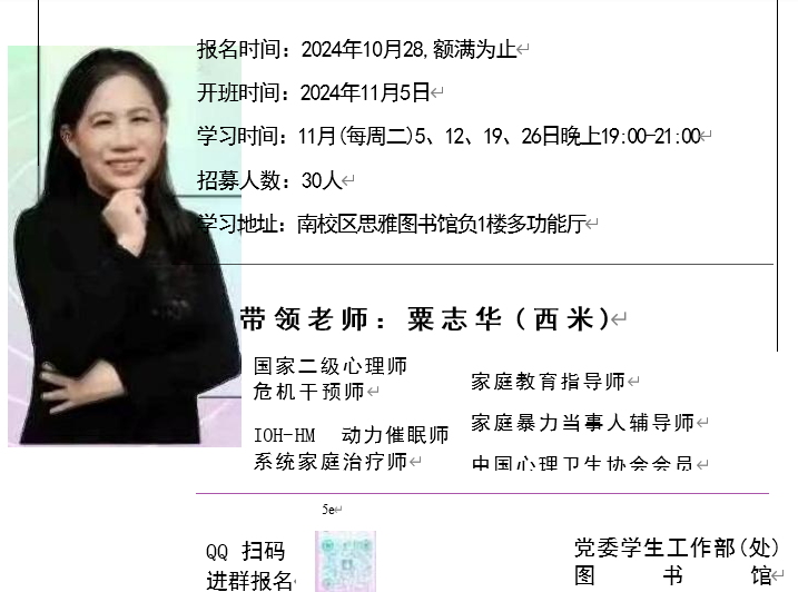 “爱的语言 (NVC) 真人图书馆”暨非暴力沟通团体辅导,创办于2014年6月, 带领者为我校图书馆馆员、国家二级心理师粟志华老师,截止2024年9月共组织了 118期学习活动,受益读者达3283人次。