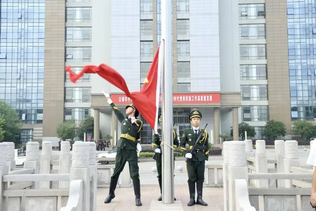 2025年10月27日晨曦初露,七时的天空被轻纱般的云层温柔笼罩。晨曦的第一缕微光刚刚挣脱夜色的束缚,校园还笼罩在氤氲雾气中,为贵州民族大学平添了几分庄重静谧。此刻,贵州民族大学南北校区同步举行秋季学期第11周升旗仪式,化学工程学院、法学院师生代表及国护队成员齐聚国旗台前,一场庄严肃穆的升旗仪式在晨光熹微中徐徐启幕。全体师生以赤子之心向祖国致以崇高敬意,凝聚起砥砺奋进的磅礴力量。
