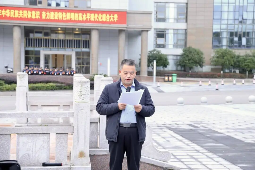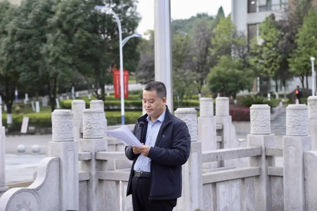 升旗礼毕,法学院党委书记柏云兴老师发表国旗下的讲话。他首先阐释了国旗与国歌的精神内核——作为新中国的象征,五星红旗与庄严国歌承载着民族精神血脉,凝聚着时代奋进豪情,如明灯般照亮着师生成长之路。